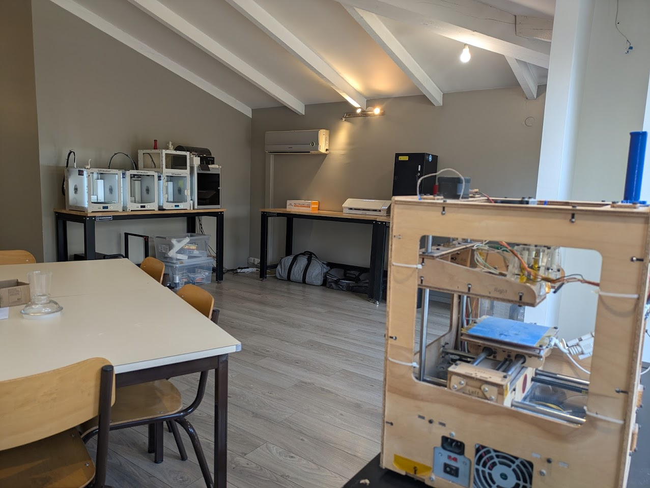 Notre espace est ouvert à tous : on y trouve des imprimantes 3D, une découpe laser, une fraiseuse CNC, du matériel de marquage textile, de la découpe vinyle et un atelier électronique complet pour le prototypage et l'expérimentation.