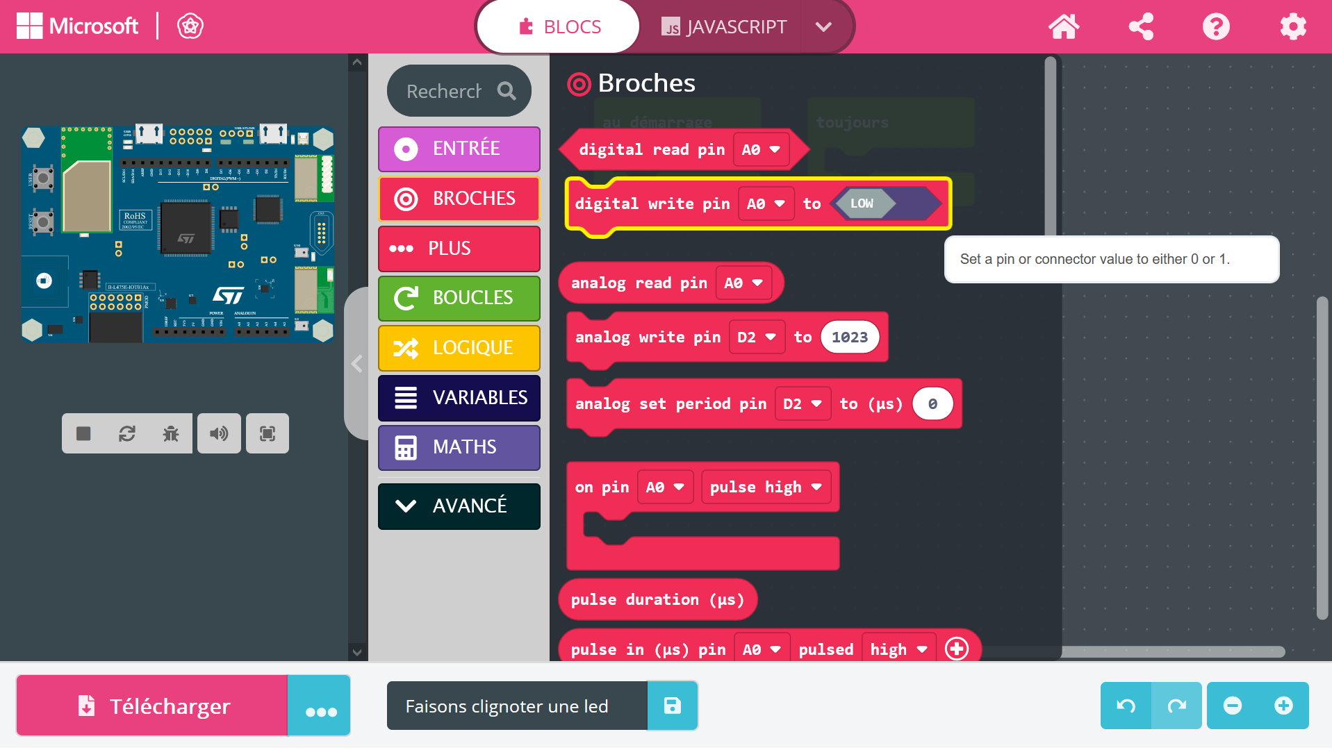 Découvrir la programmation par blocs avec MakeCode en faisant clignoter la LED intégrée d'une carte STM32 IoT Node.