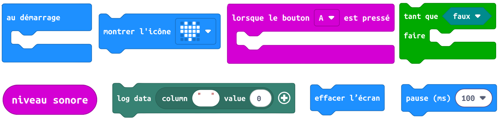 Pour réaliser ce programme i.e. utiliser une carte programmable pour relever les niveaux de décibel dans une pièce ou un lieu donné, nous utiliserons les blocs suivants :