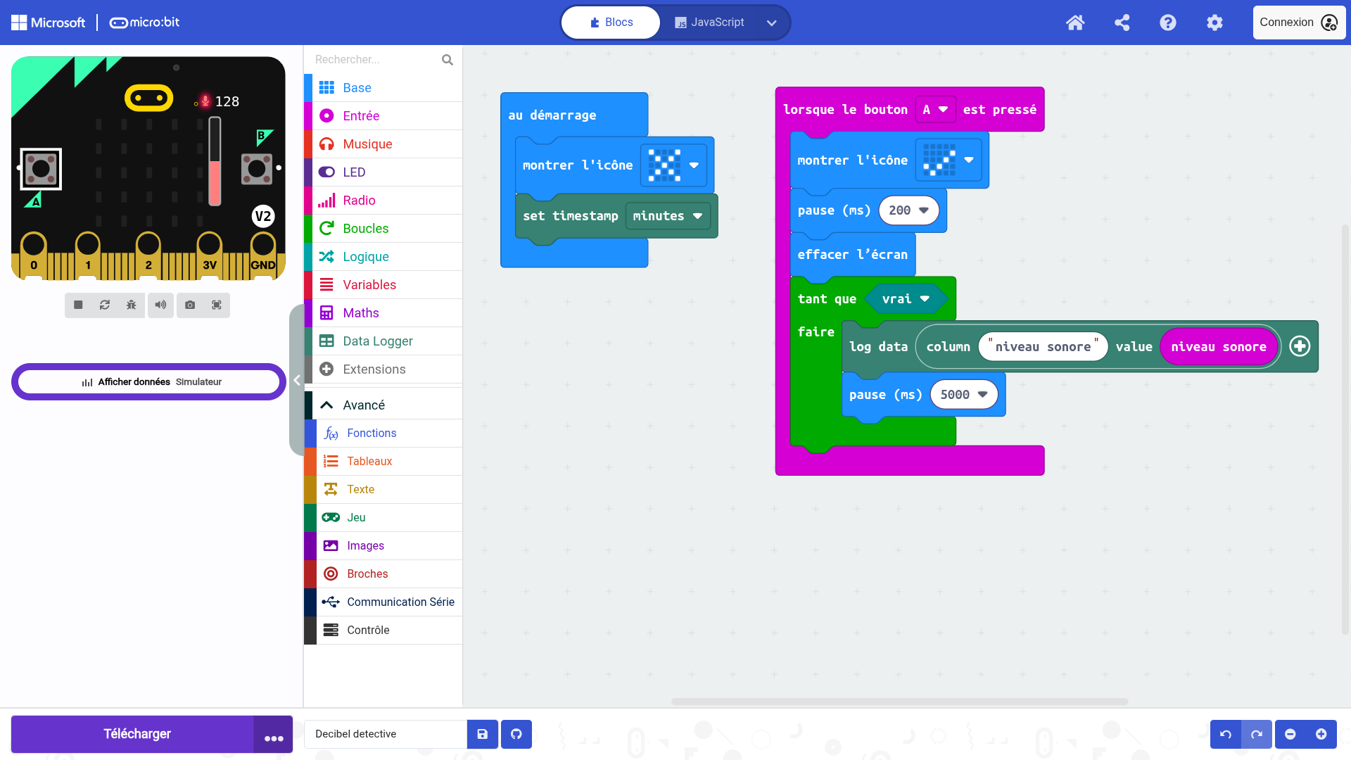 Une fois ces blocs identifiés, vous pouvez commencer à organiser vos blocs pour permettre à la carte de collecter le niveau sonore. Testez des configurations selon ce qui vous semble logique et utilisez le simulateur pour vérifier que votre code fait ce que vous attendez de lui.
