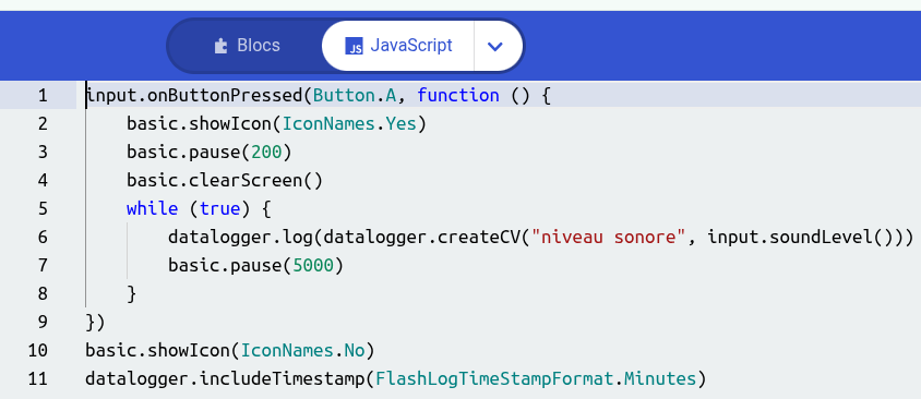 Voici ce que doit dire notre code : quand j'allume ma carte, une croix m'indique que le programme attend d'être lancé. J'appuie sur le bouton A. La carte m'indique qu'elle est prête à collecter des données. Après une courte pause, la coche s'efface de l'écran et la carte commence sa collecte jusqu'à ce que j'appuie sur un autre bouton que le bouton A. Durant tout ce temps, elle collecte le niveau sonore, dans un tableau qui me donnera les informations suivantes : toutes les 5 000 secondes, exprimées en minutes, la carte fournira le "niveau sonore".