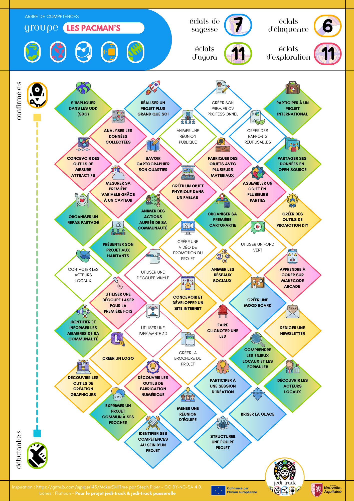 Les Maker Skill Trees s'intègrent parfaitement dans les projets d'animation jeunesse pour structurer les activités, motiver les participants et valoriser leurs progressions. En animation, nous menons souvent des projets riches, mais nous manquons d'outils ou de temps à dédier à l'évaluation qui soit à la fois adaptée au public, flexible, amusante et ludique.
