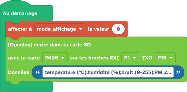 Dans notre cas, nous allons enregistrer les 8 mesures citées plus haut. Il faut donc, au démarrage du programme, écrire sur la carte micro-sd les en-tête des colonnes correspondantes :