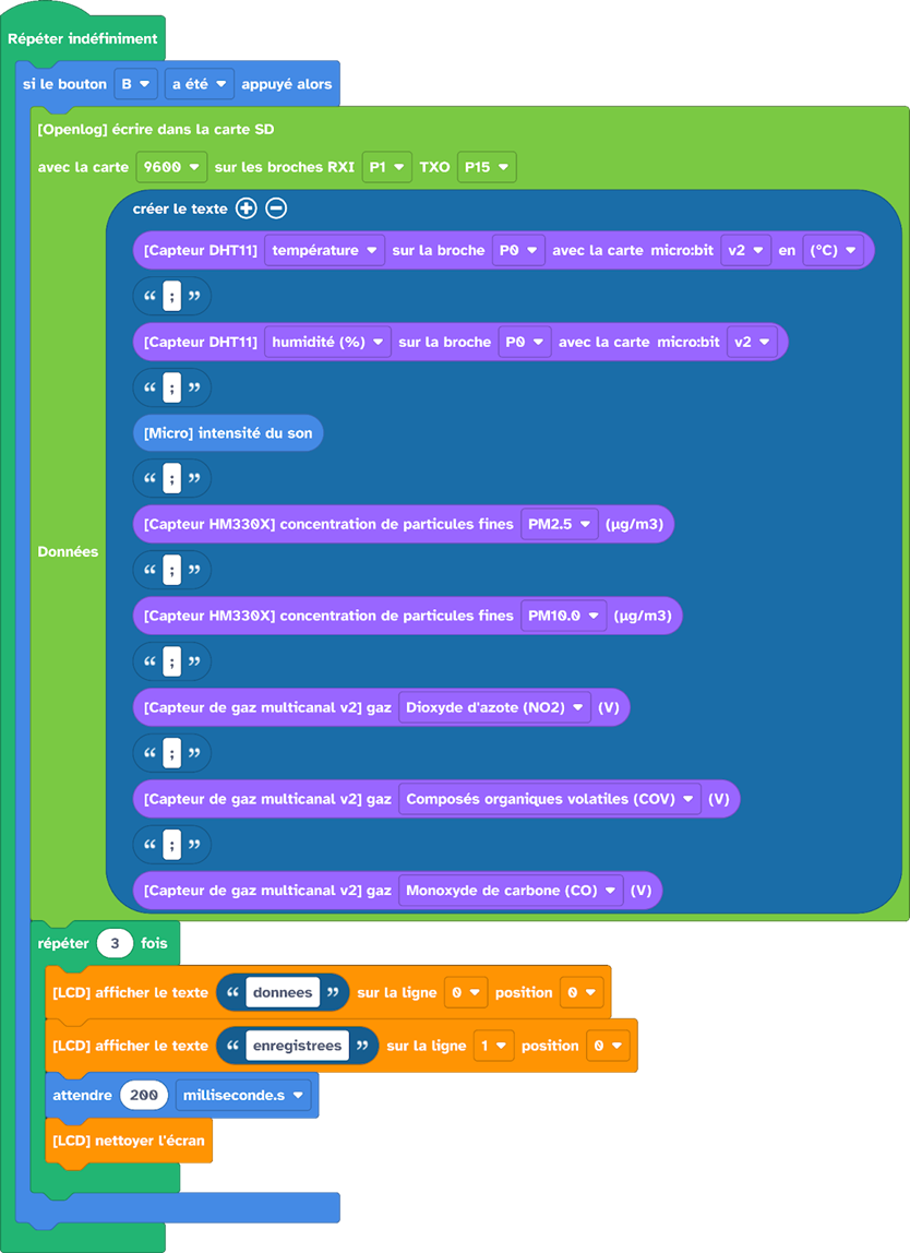 Ensuite, nous avons choisi d'enregistrer une nouvelle donnée sur la carte micro-sd à chaque fois que le bouton B de la micro:bit est appuyé. Vous pouvez aussi modifier le programme pour prendre une mesure toutes les x périodes de temps (pensez à rajouter dans les données enregistrées le temps correspondant à chaque mesure). Dans notre cas, on vérifie donc à chaque tour de boucle si le bouton B a été appuyé, et auquel cas on enregistre les données sur la carte micro-sd et on affiche un message sur l'écran pour confirmer que les données ont bien été enregistrées (notez que le programme de la section précédente a été masqué ici pour des questions de lisibilité) :
