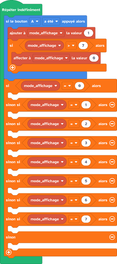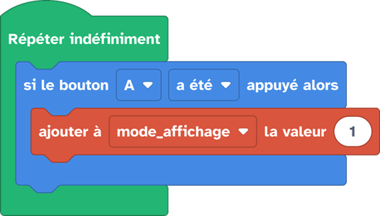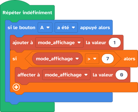 Dans cette boucle, nous allons vérifier si le bouton A de la micro:bit a été appuyé, et si c'est le cas, nous augmenterons la valeur de la variable mode_affichage de 1 :