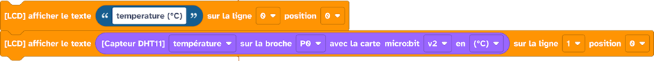 Il suffit maintenant d'afficher la bonne mesure sur l'écran LCD selon le cas dans lequel on se trouve. Pour cela, il faut utiliser le blocs suivants, présents dans la catégorie Affichage :