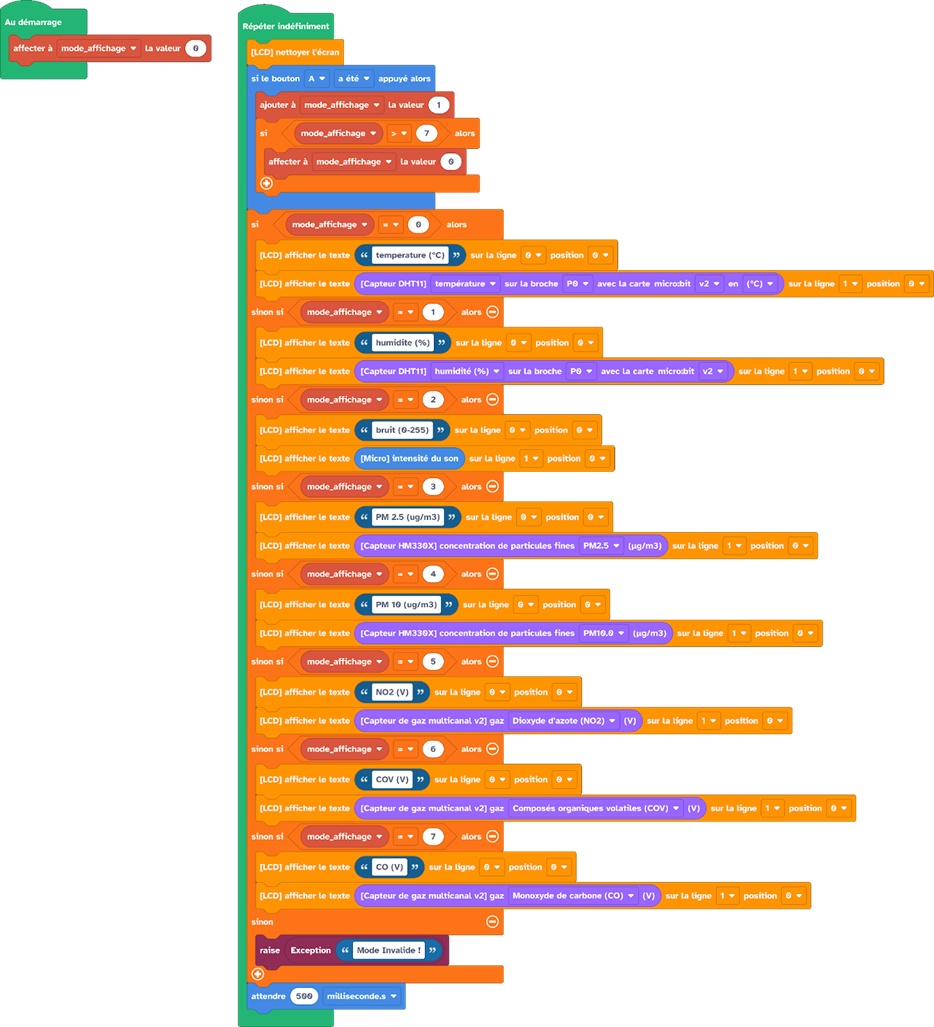 Pour compléter le programme, tous les blocs de mesure se trouvent dans la catégorie Capteurs, excepté le bloc de mesure de l'intensité sonore qui se trouve dans la catégorie Entrées/Sorties.