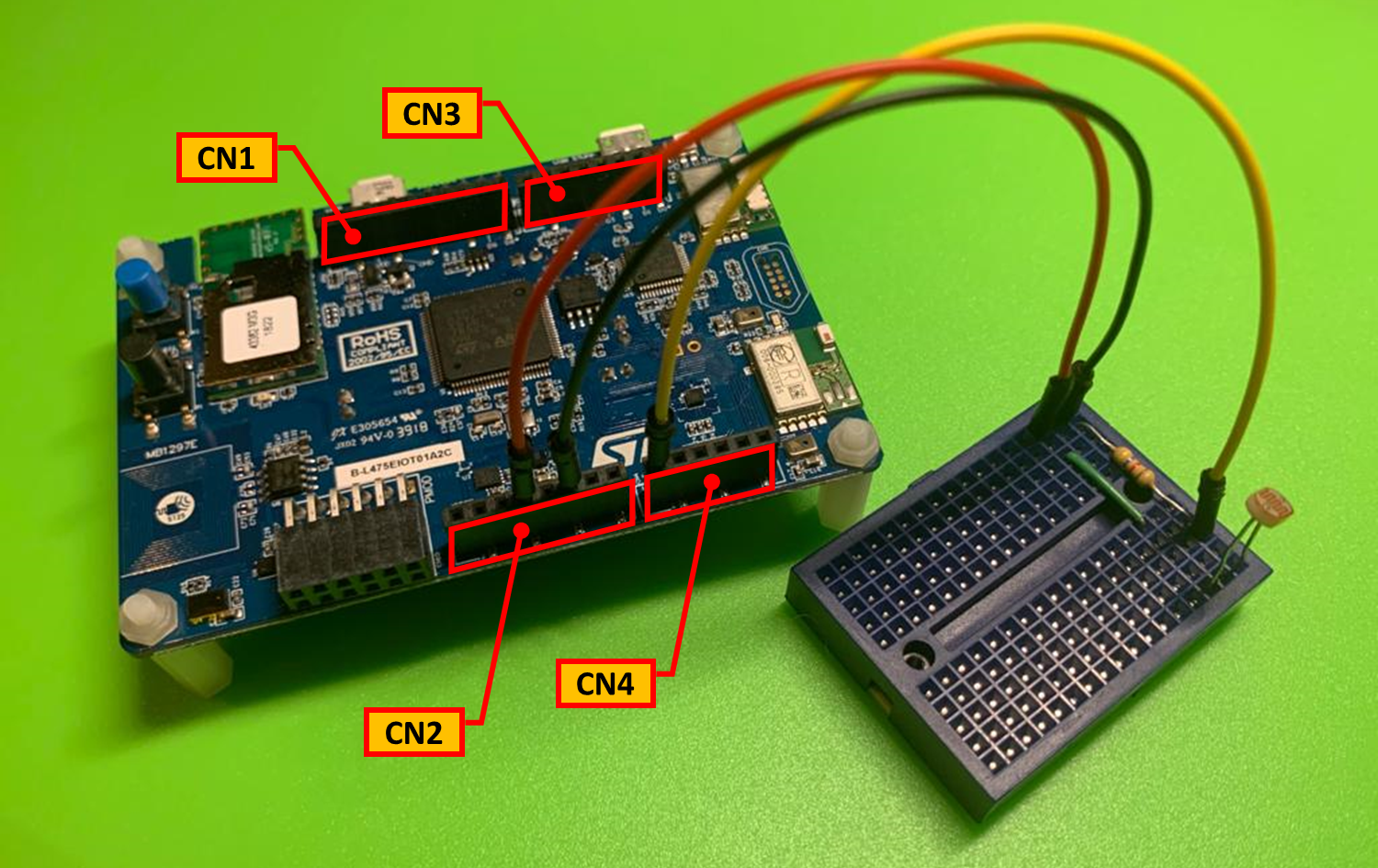 Le fil rouge doit être connecté à la broche 4 du bloc CN2, qui est connectée en interne à un potentiel de 3,3 V. Le fil noir doit être connecté à la broche 6 du bloc CN2, qui est connectée en interne au potentiel de masse (GND). Enfin, le fil jaune doit être connecté à la broche 1 du bloc CN4. Cette broche est connectée en interne à la broche d'entrée analogique nommée A0.