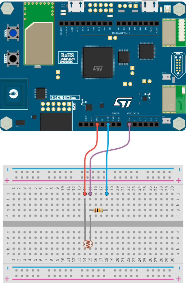 2. Câbler la breadboard à la carte STM32 IoT Node Board
