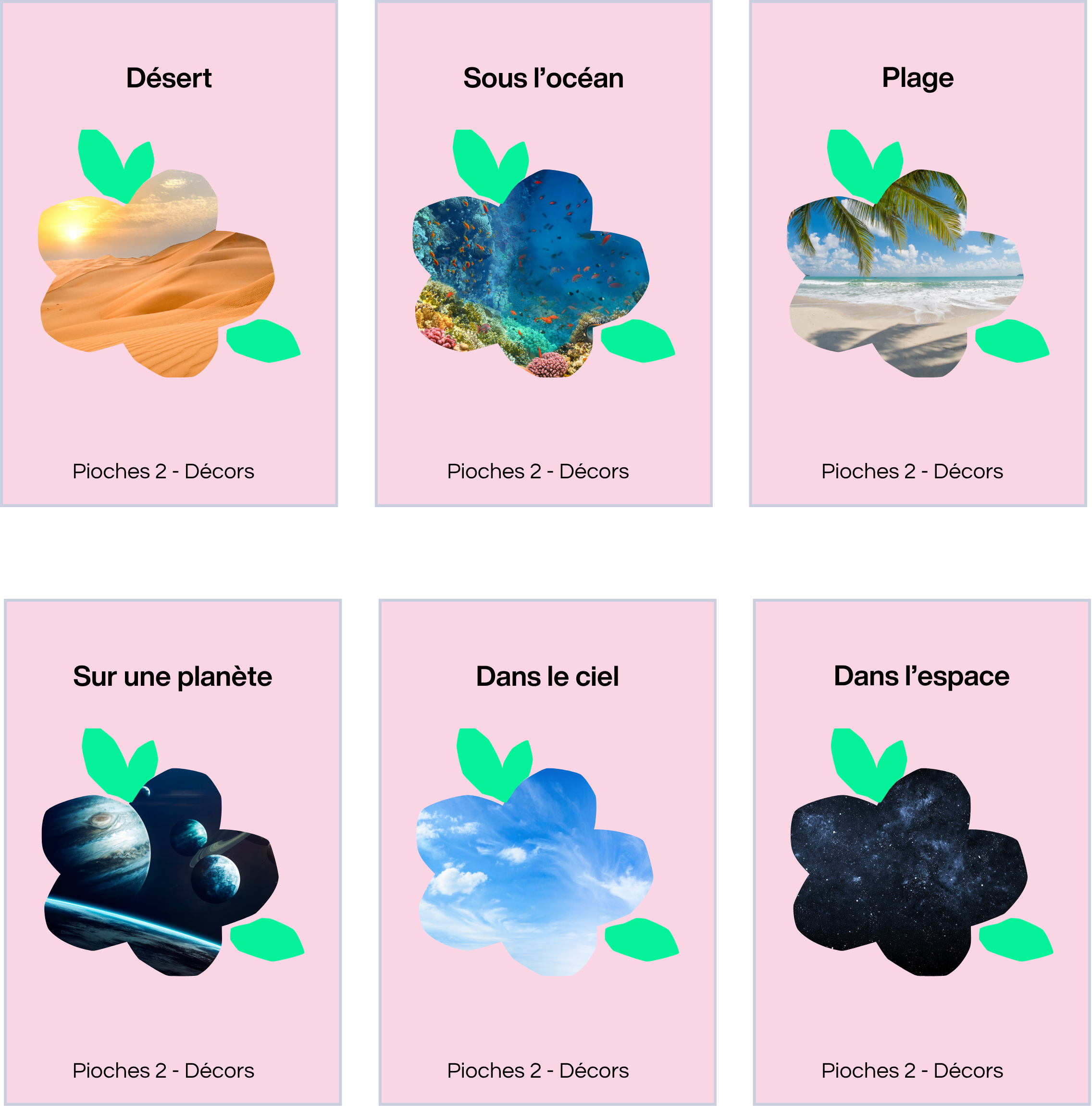 Jungle ; Forêt ; Jardin ; Désert ; Sous l'océan ; Plage ; Sur une planète ; Dans le ciel ; Dans l'espace ; Pays imaginaire ; Laboratoire scientifique ; En ville ; À la campagne ; Grotte mystérieuse ; Au zoo ; À la montagne ; Usine de robots ; Champ de panneaux solaires ; Dans un parc éolien.