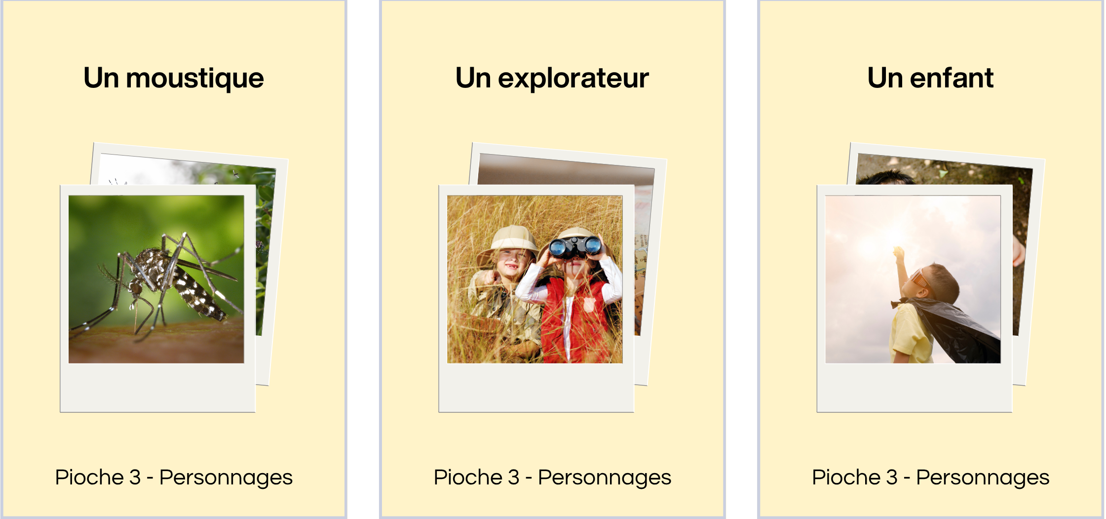 Piles de cartes (Concepts scientifiques, Décors, Personnages, Contraintes) et un modèle « Reproduisez vos propres cartes » pour créer vos propres cartes (thème, sujet, décor, personnage, contrainte).