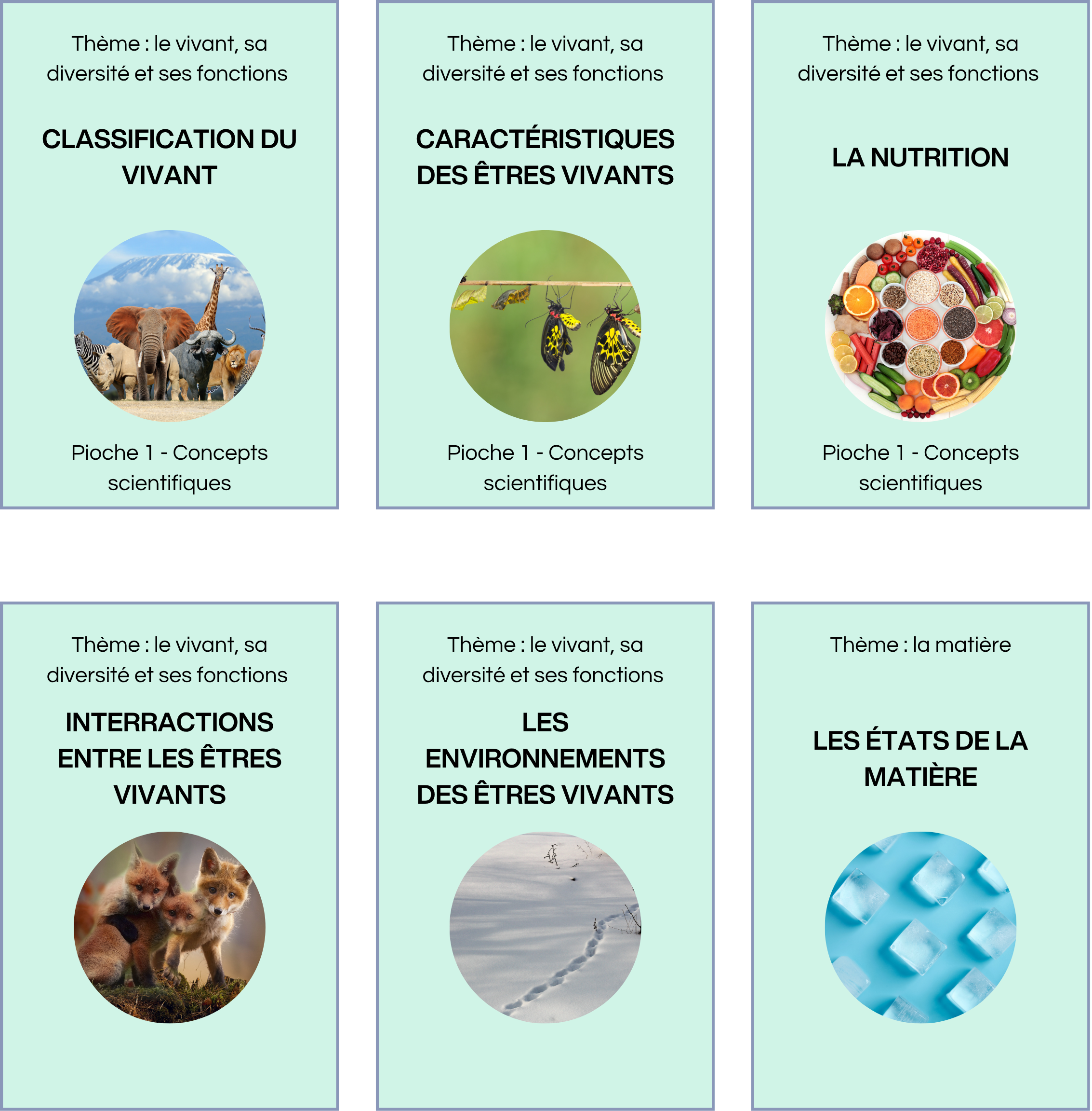 L'activité "Conteurs de Sciences" est conçue pour offrir aux élèves une manière amusante et créative de découvrir et d'apprendre les sciences. Elle vise à stimuler la curiosité scientifique des plus jeunes et à améliorer leur compréhension des concepts scientifiques par le biais du théâtre. L'objectif principal de cette activité est d'encourager les élèves à utiliser leur créativité et leurs connaissances scientifiques pour improviser des sketchs et jeux de rôles, réinvestissant ainsi les concepts scientifiques appris en cours. En groupes de deux ou trois élèves, ils tireront quatre cartes différentes, chacune représentant un élément différent. La première carte détermine le concept scientifique, la deuxième carte fournit un élément défini qu'ils doivent intégrer dans leur improvisation, la troisième carte leur attribue un personnage à inclure dans leur histoire et la quatrième carte leur donne des instructions sur la façon d'improviser.