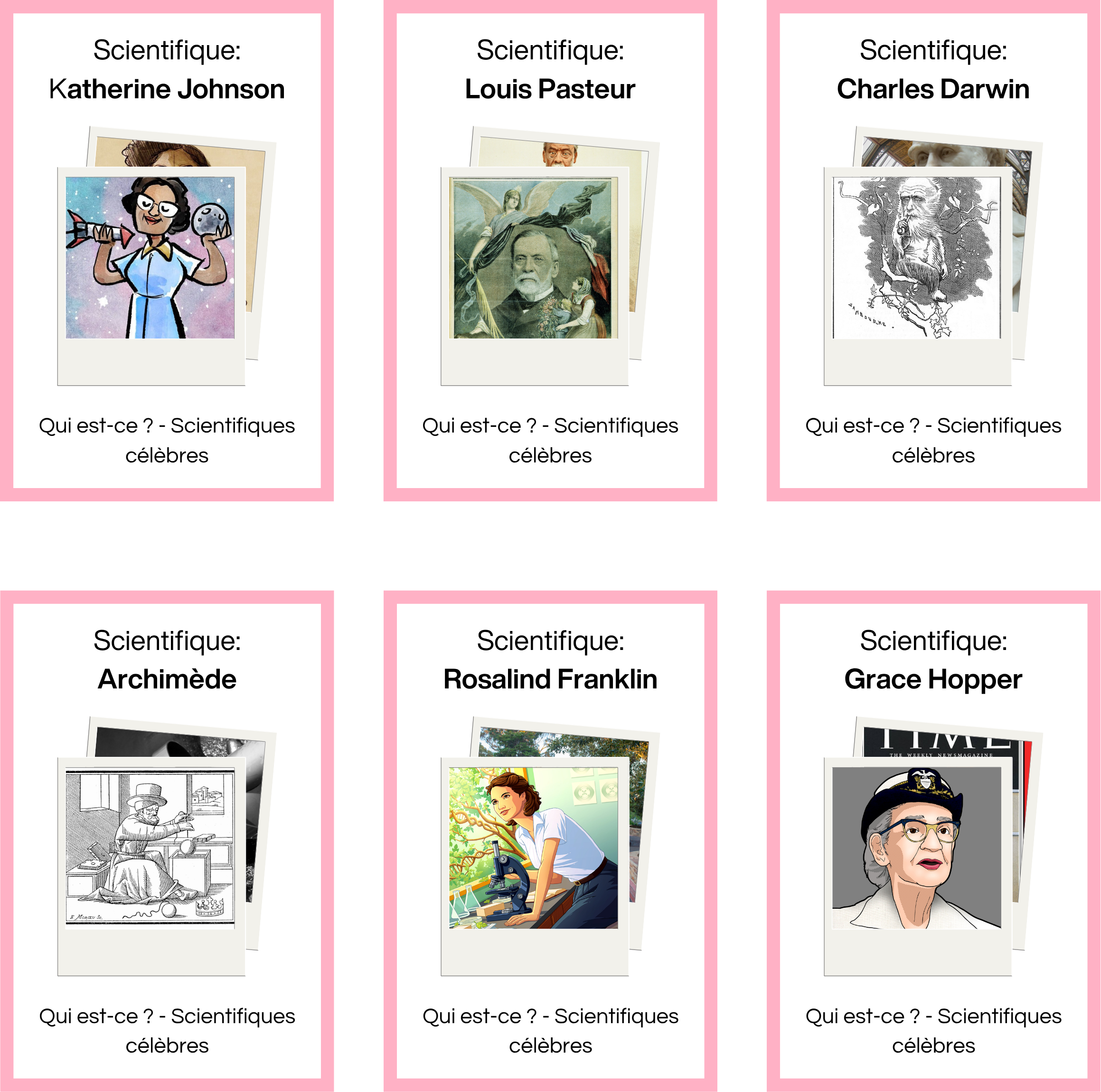 Cartes fournies : Albert Einstein ; Michael Faraday ; Isaac Newton ; Marie Curie ; Ada Lovelace ; Katherine Johnson ; Louis Pasteur ; Charles Darwin ; Archimède ; Rosalind Franklin ; Grace Hopper ; Dian Fossey ; Galilée ; Léonard de Vinci ; Alan Turing ; Marthe Gautier ; Mary Anning (plus une carte vierge à compléter).