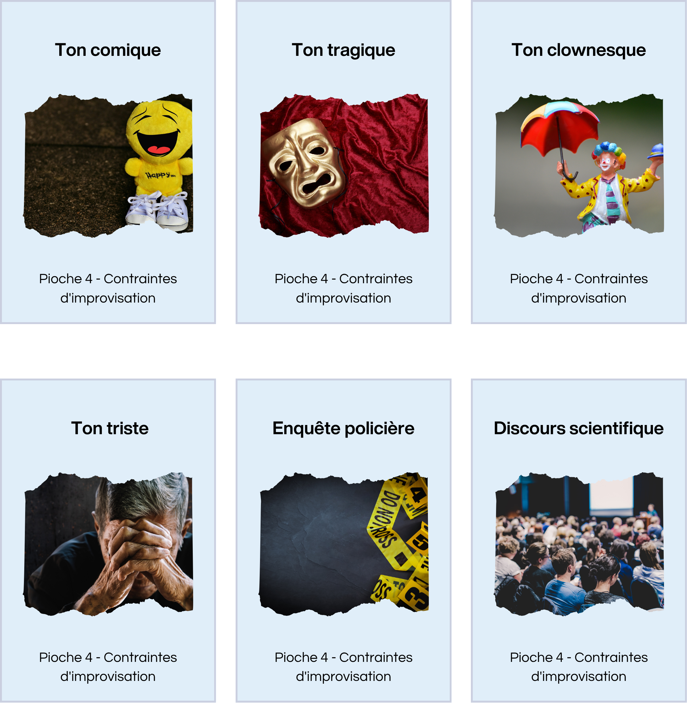 En groupe de 2 ou 3 élèves, ils piochent 4 cartes différentes parmi les 4 jeux fournis. Le premier concerne le concept scientifique sur lequel ils vont improviser ; le second leur donne un élément de décor à utiliser dans leur improvisation ; le troisième leur donne un personnage à inclure dans leur histoire ; enfin, la dernière carte leur donne des instructions pour improviser.