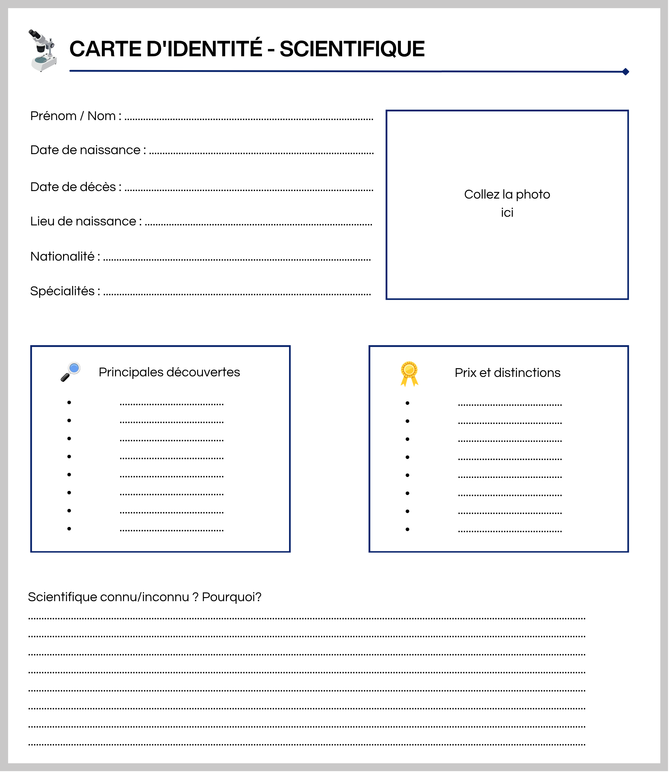 Cartes scientifiques célèbres et fiche d'identité imprimable (Prénom/Nom, date de naissance, date de décès, lieu de naissance, nationalité, spécialités, principales découvertes, prix et distinctions, « Scientifique connu/inconnu ? Pourquoi ? »).