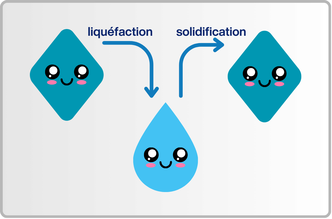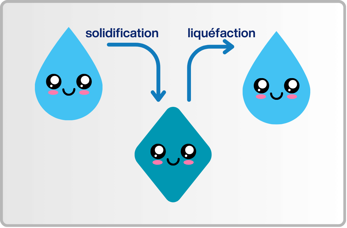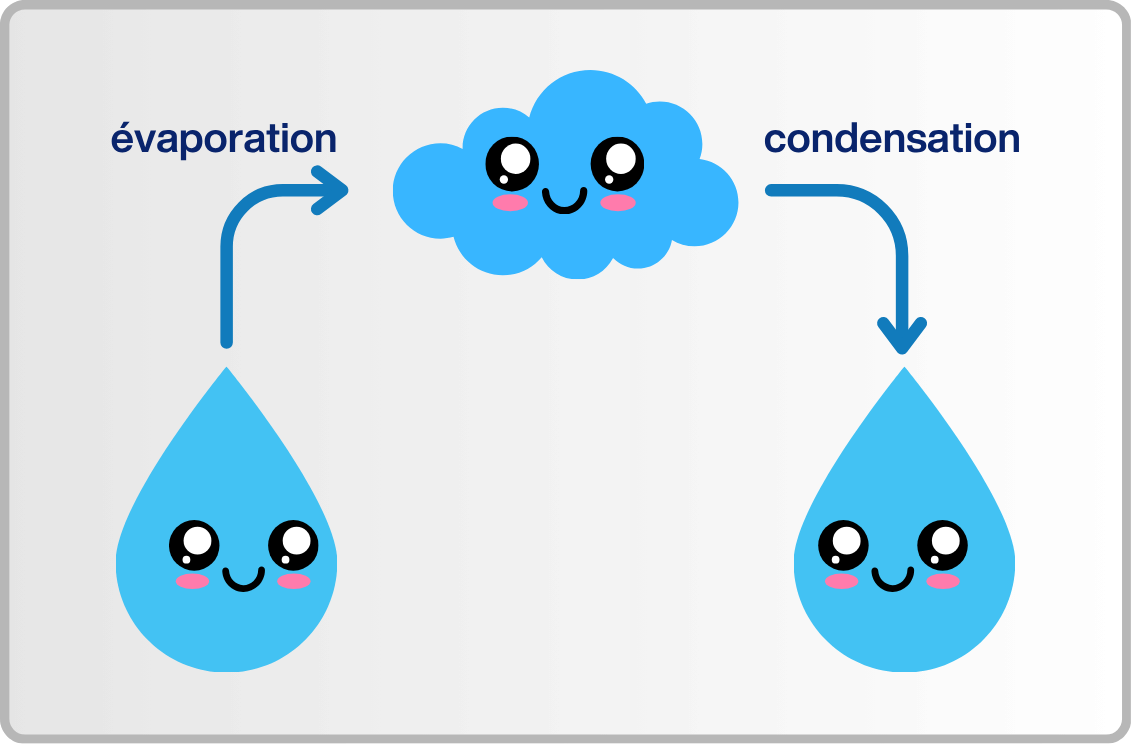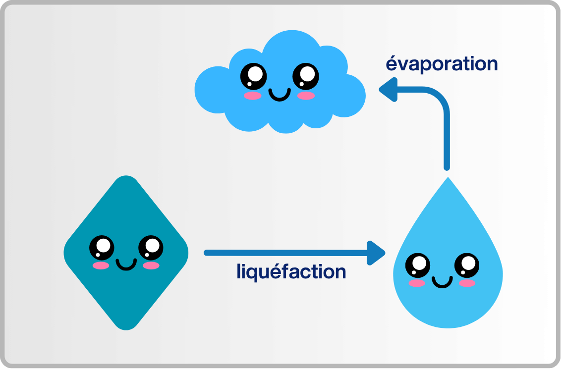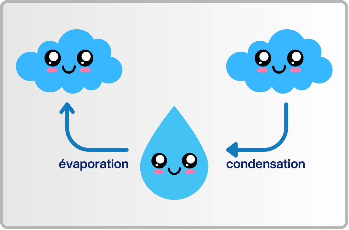 Cartes « États globaux de l'eau et processus de changement » combinant les trois états (solide, liquide, gazeux) avec les processus : évaporation, condensation, solidification, liquéfaction.