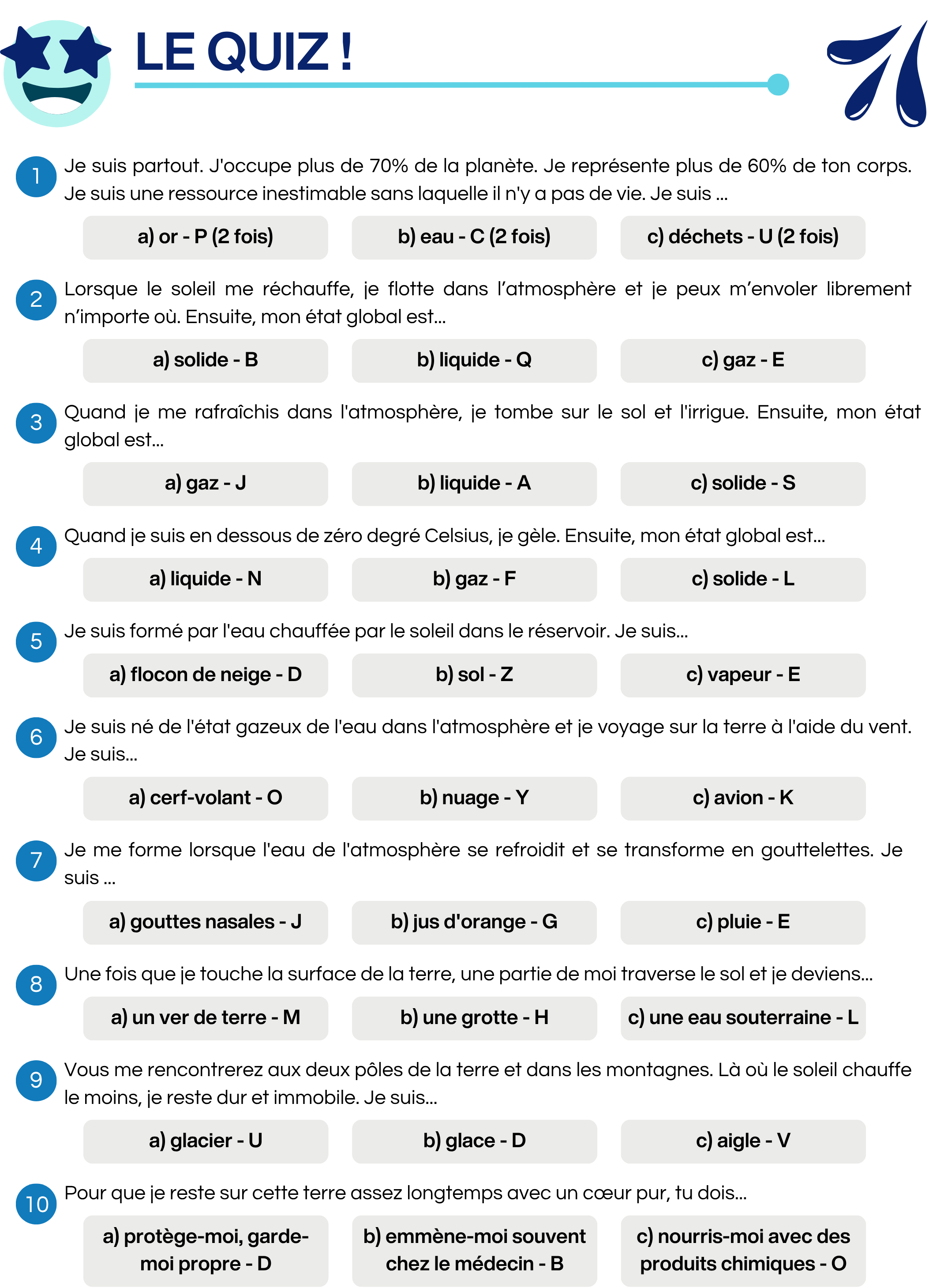 Le quiz complet avec les 10 questions et les cartes-lettres permettant de reconstituer la phrase cachée « CYCLE DE L'EAU » sont téléchargeables dans le PDF.