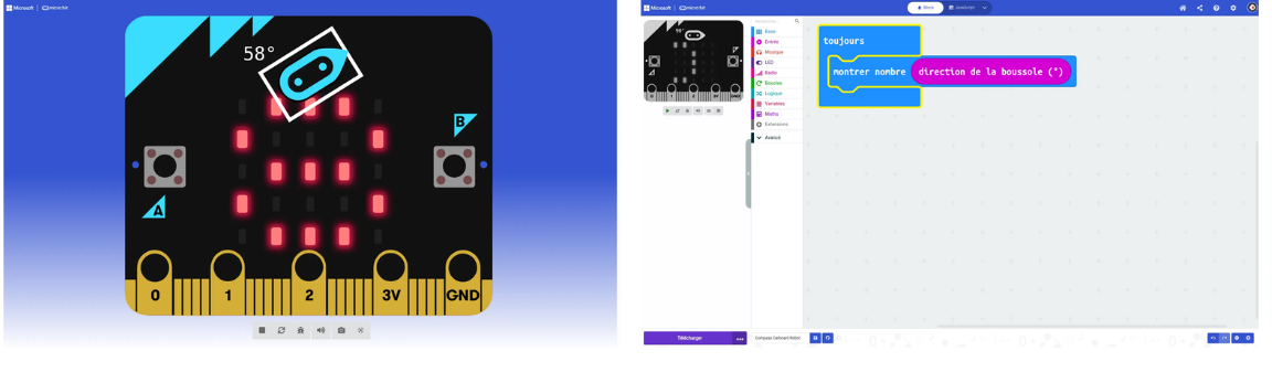 Dans le bloc « toujours » (bloc de base), affichez simplement la direction de la boussole avec les blocs « montrer nombre » (bloc de base) et « direction de la boussole » (bloc d'entrée). Testez sur l'émulateur (cliquez sur la boussole simulée) puis sur une vraie carte micro:bit. Les élèves voient défiler des nombres qui changent quand ils tournent la carte.