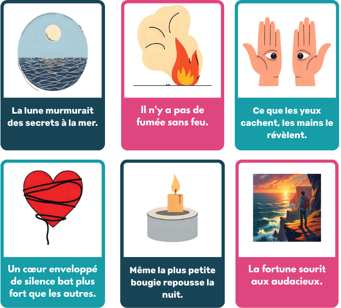 - Rassemblez des objets « trésors » : petits jouets, articles de bricolage, blocs colorés, ainsi que des phrases imprimées sur des cartes (proverbes, vers de poésie, voir exemple en annexe).