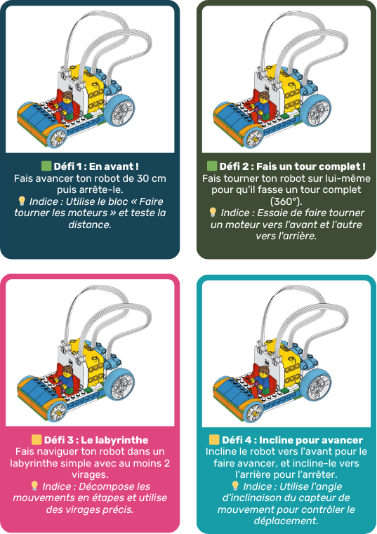 Défi 4 : Incline pour avancer Incline le robot vers l'avant pour le faire avancer, et incline-le vers l'arrière pour l'arrêter. Indice : Utilise l'angle d'inclinaison du capteur de mouvement pour contrôler le déplacement.
