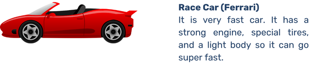 Race Car (Ferrari) — It is very fast car. It has a strong engine, special tires, and a light body so it can go super fast.