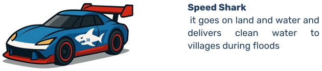 Speed Shark — It goes on land and water and delivers clean water to villages during floods.