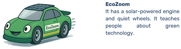 Encouragez-les à ajouter l'impact social que leur voiture apportera, par exemple : « It helps clean the air » (Elle aide à purifier l'air) ou « It brings food to faraway villages » (Elle apporte de la nourriture aux villages éloignés).