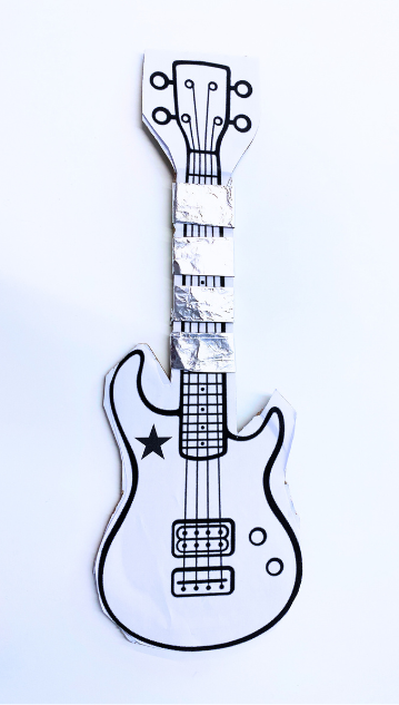 Distribuez le matériel à chaque groupe : impression de la guitare basse, carton, colle, ciseaux, feutres, ruban adhésif, papier aluminium, Makey Makey et pinces crocodiles.