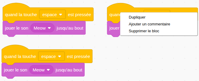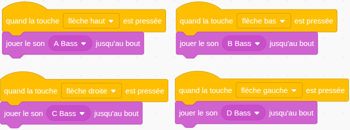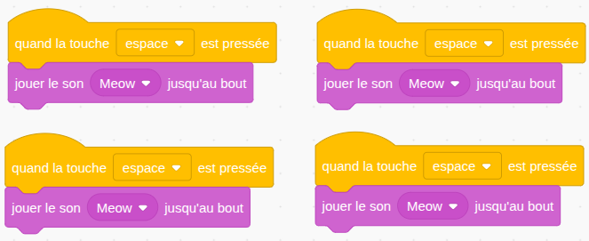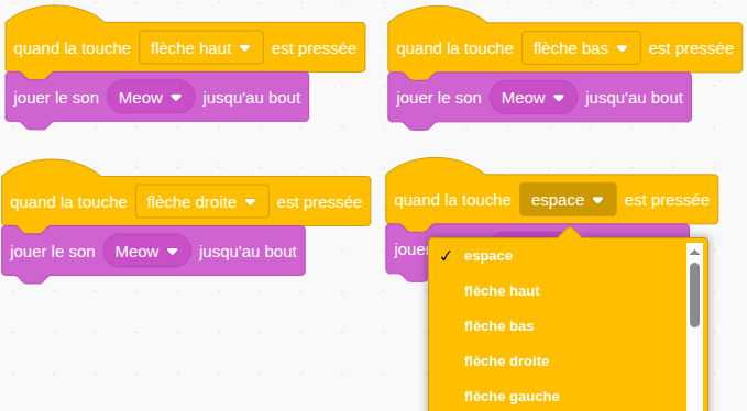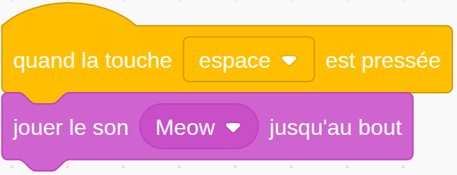 Sélectionnez ces blocs dans les catégories « Événements » et « Son ». Bloc « quand la touche espace est pressée » + bloc « jouer le son ... jusqu'au bout ».