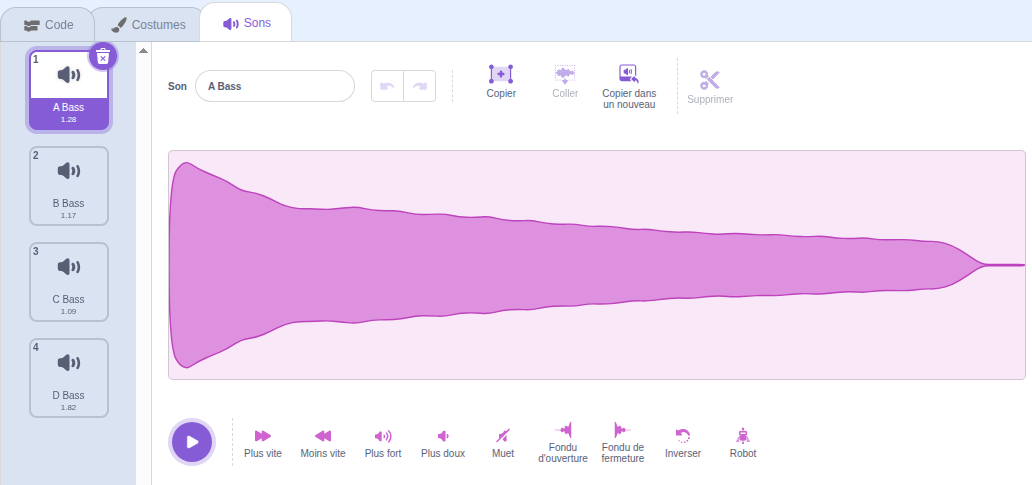 Les sons de guitare basse sont déjà disponibles dans la bibliothèque Scratch, il suffit de bien sélectionner les sons de BASSE !