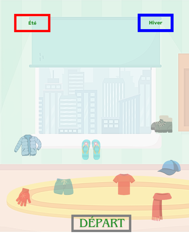 Créez une grande grille au sol à l'aide de ruban adhésif ou de papier. Vous pouvez également imprimer la grille exemple fournie en annexe. La grille représente la chambre du robot où sont éparpillés différents vêtements. En haut de la grille, placez deux zones : une pour l'été et une pour l'hiver. Chaque zone est entourée d'une couleur spécifique (rouge pour l'été, bleu pour l'hiver).