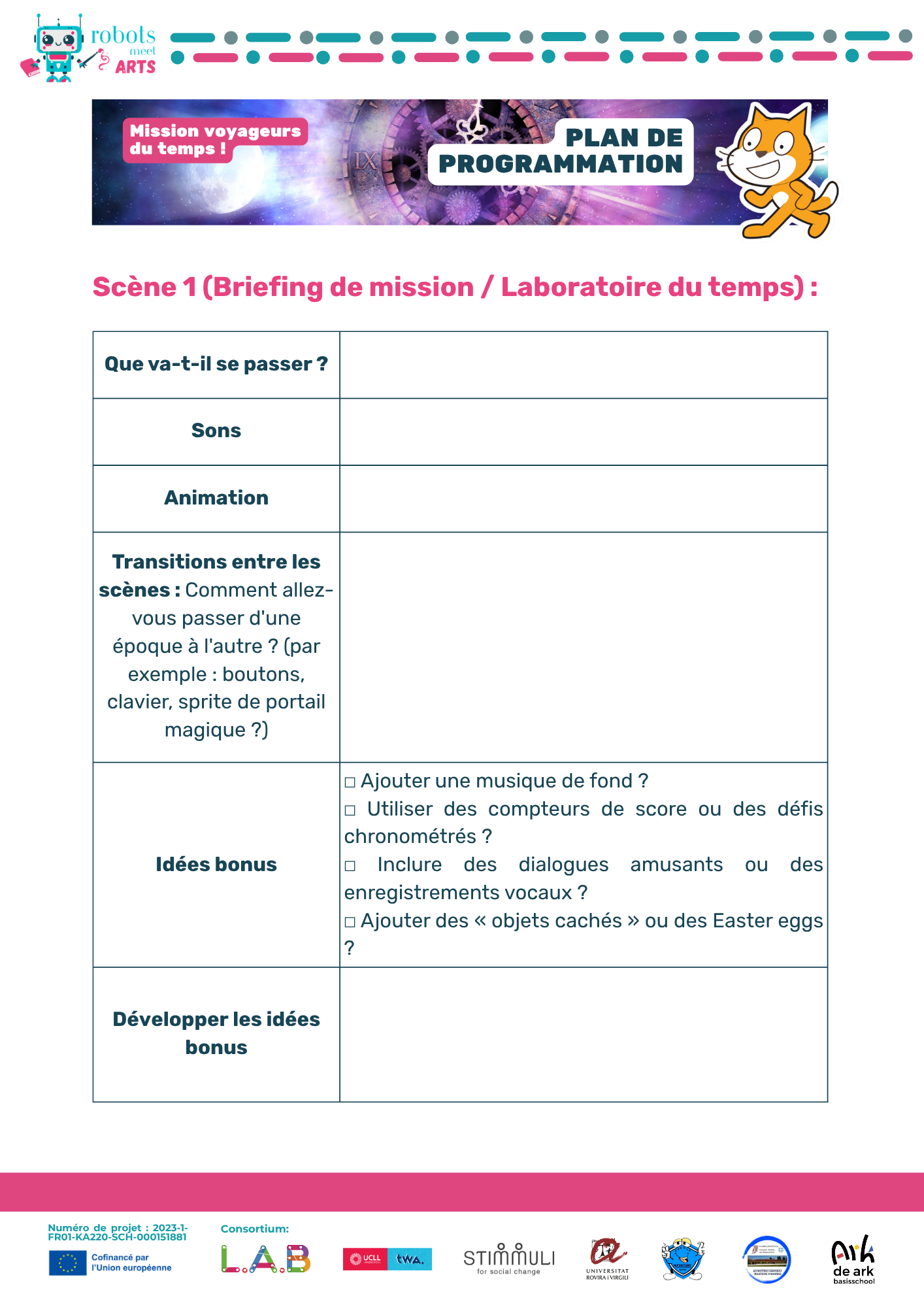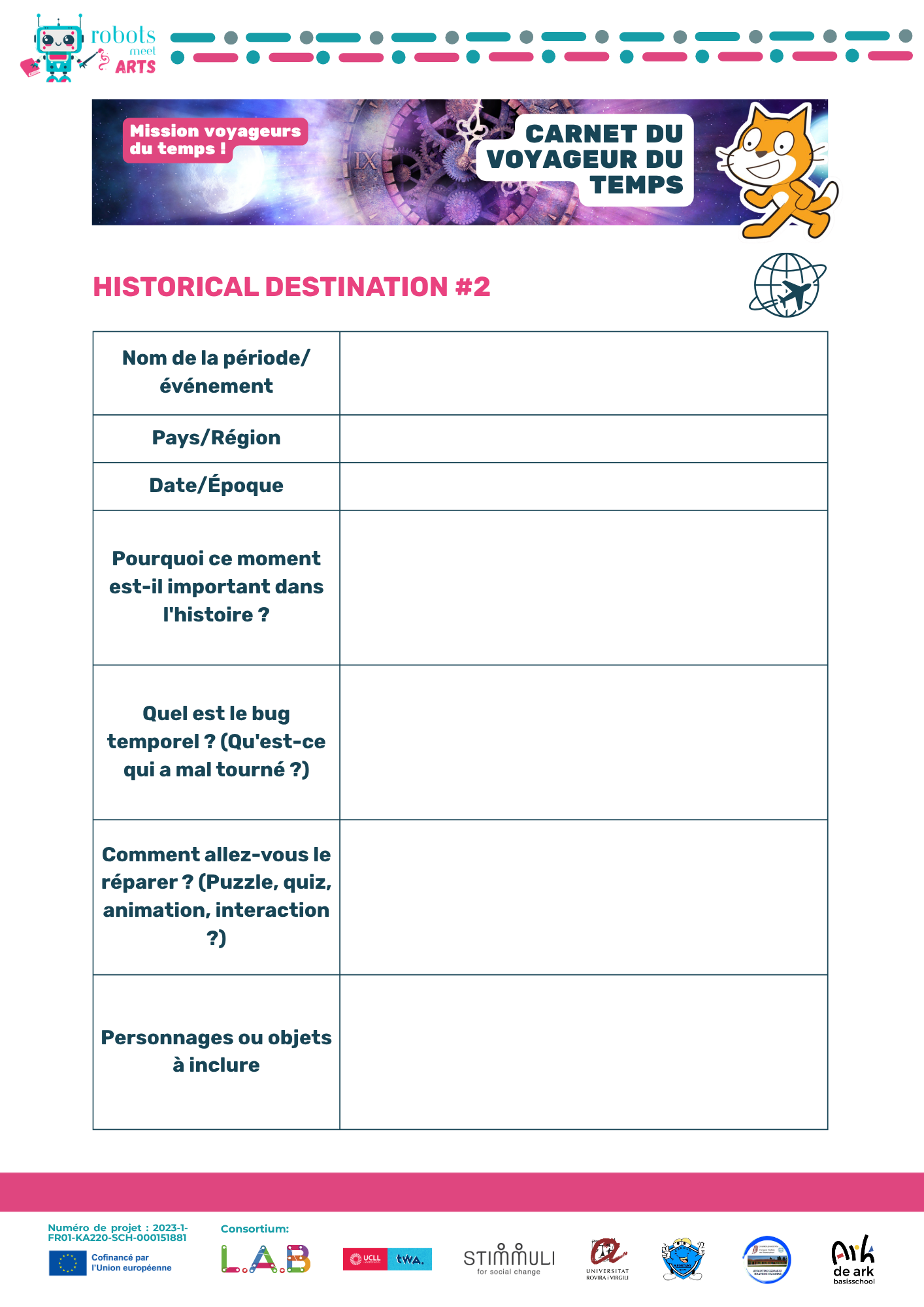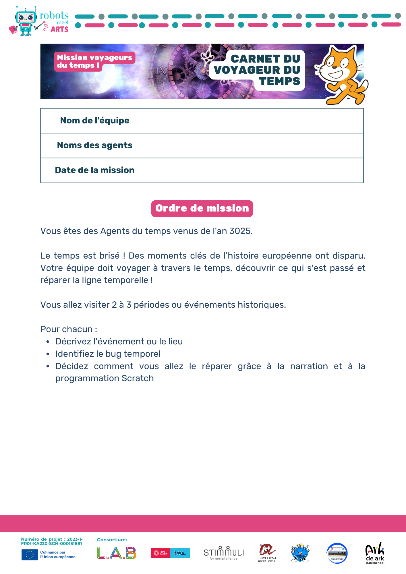 Ce guide accompagne les enseignant·e·s dans la mise en oeuvre de l'activité « Mission Voyageurs du temps » à l'échelle européenne. Les élèves deviennent des Agents du temps, identifiant et réparant des bugs temporels dans des événements historiques majeurs à travers l'Europe en utilisant Scratch. Le projet favorise la créativité, les compétences numériques, la collaboration et la sensibilisation à l'histoire interculturelle.