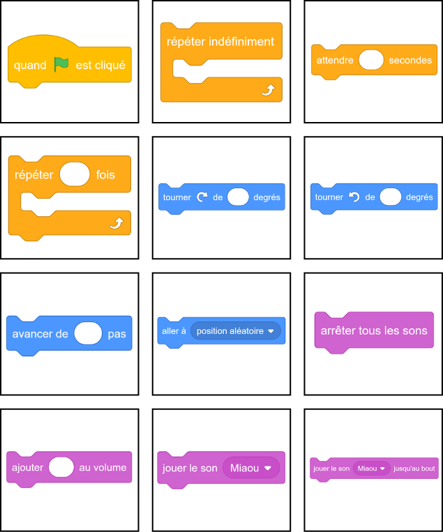 Préparez des paires de cartes pour le jeu « Memory » : une carte avec l'image du bloc Scratch et une autre avec sa description/fonction. Les cartes sont disponibles en annexe dans la partie « Ressources imprimables ». Prévoyez plusieurs lots de cartes pour pouvoir jouer en petit groupe.