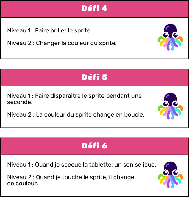 Avant de commencer le défi 8, pensez à donner une instruction supplémentaire aux élèves : la vidéo d'instruction 2. Celle-ci leur permet d'ajouter un second sprite (leur propre création à partir du cercle). Dans le défi 8, ils programment le cercle et le sprite qu'ils ont créé. Un exemple de programme est disponible en vidéo dans le PowerPoint.