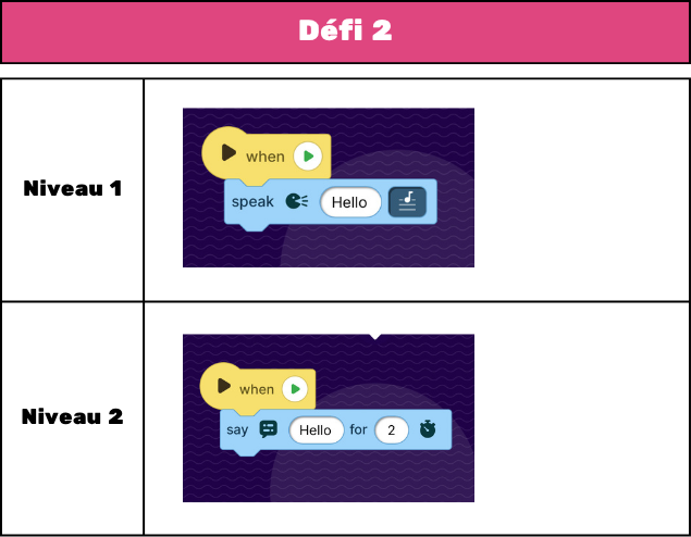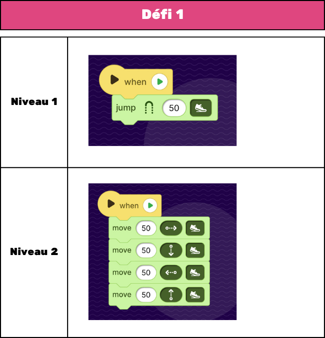 Il est conseillé de réaliser le premier défi tous ensemble en classe entière. Les élèves peuvent ensuite choisir s'ils souhaitent réaliser le Niveau 1 ou le Niveau 2. Le Niveau 2 est plus difficile. En haut à droite de chaque carte défi, la catégorie de blocs à utiliser est indiquée.