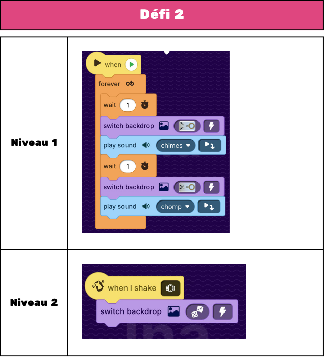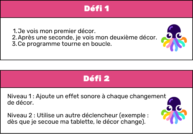 - Niveau 2 : Utilise un autre déclencheur (exemple : dès que je secoue ma tablette, le décor change).