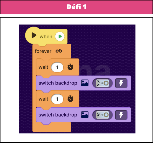 Distribuez les cartes défis avec le pseudocode. Laissez les élèves trouver le programme par eux-mêmes. Une fois terminé, ils peuvent passer au défi 2.