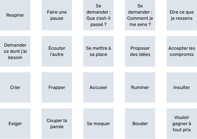 Valides : Respirer, Faire une pause, Se demander « Que s'est-il passé ? », Se demander « Comment je me sens ? », Dire ce que je ressens, Demander ce dont j'ai besoin, Écouter l'autre, Se mettre à sa place, Proposer des idées, Accepter les compromis