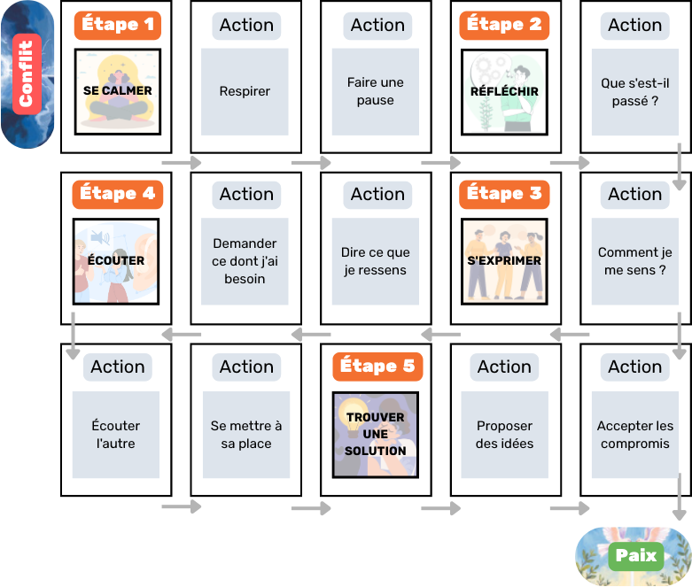- Tableau blanc et feutres pour noter les étapes de résolution de conflits proposées par les élèves