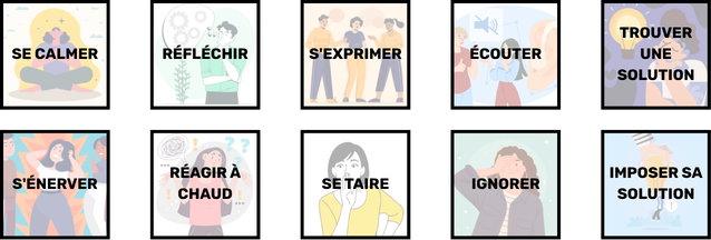 Valides : SE CALMER, RÉFLÉCHIR, S'EXPRIMER, ÉCOUTER, TROUVER UNE SOLUTION