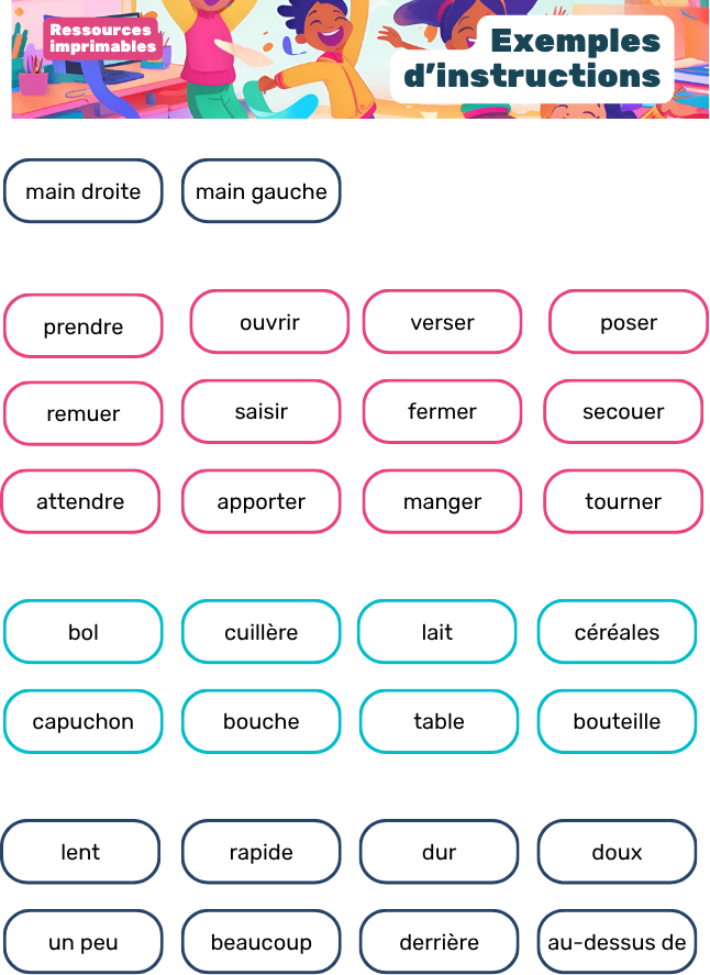 Verbes d'action : main droite, main gauche, prendre, ouvrir, verser, poser, remuer, saisir, fermer, secouer, attendre, apporter, manger, tourner