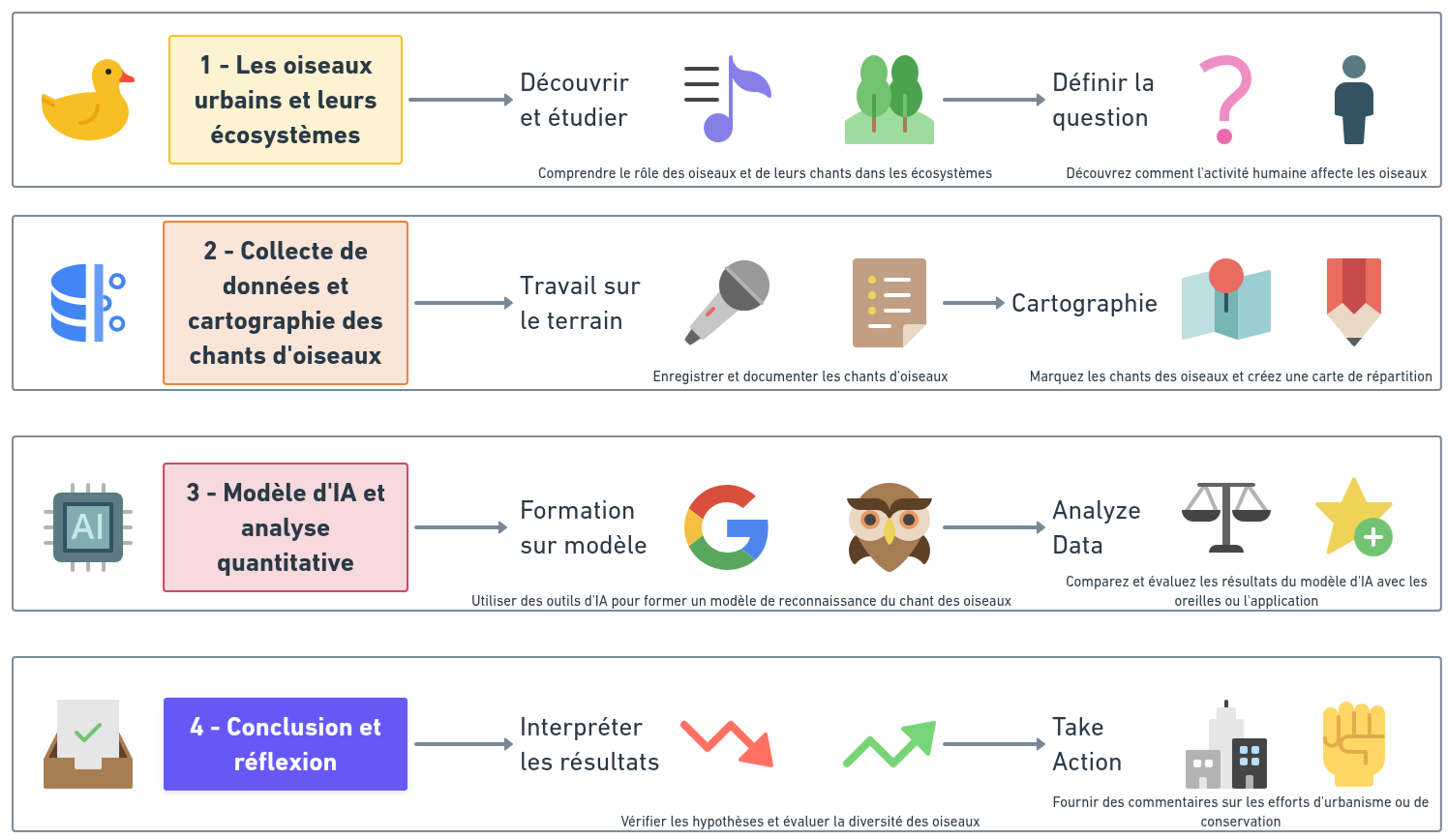En comprenant ces concepts, les élèves seront mieux préparés à mener leur enquête, à collecter des données pertinentes et à tirer des conclusions significatives sur la diversité des espèces d'oiseaux dans les zones urbaines.