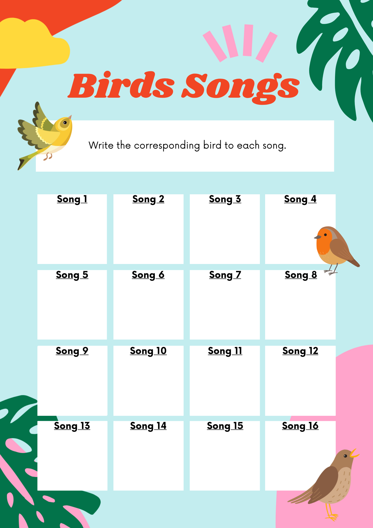 - Apprendre aux élèves à identifier les différentes espèces d'oiseaux en écoutant leurs chants, afin d'améliorer leurs capacités d'observation et leurs connaissances de la communication aviaire.