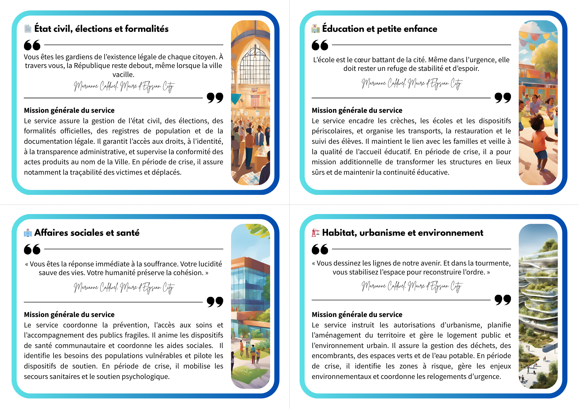 Jeu introductif. Cette première étape fait office de brise-glace et introduit la notion de services publics. Les élèves endossent le rôle de réceptionnistes municipaux, chargés de traiter une liste croissante de demandes citoyennes. L'activité les initie aux différents services municipaux et à leurs fonctions, tout en soulignant l'importance de la communication et de la coopération dans leur gestion.