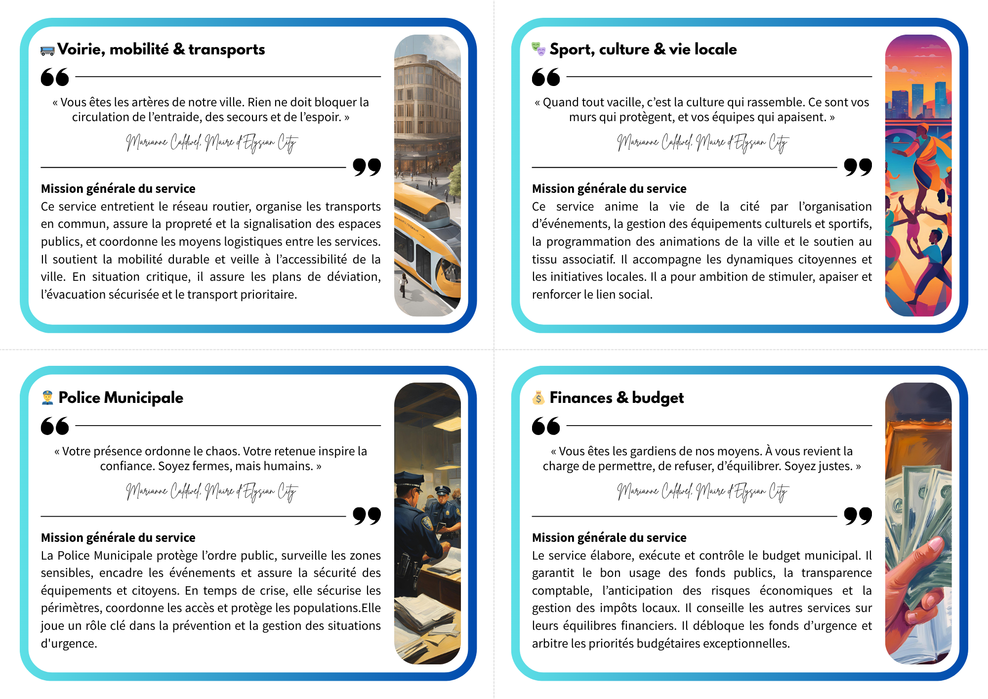 Les services abordés dans le jeu sont regroupés selon des catégories représentatives des structures municipales. Ces catégories peuvent être adaptées selon le contexte local (ville, région, pays) :
