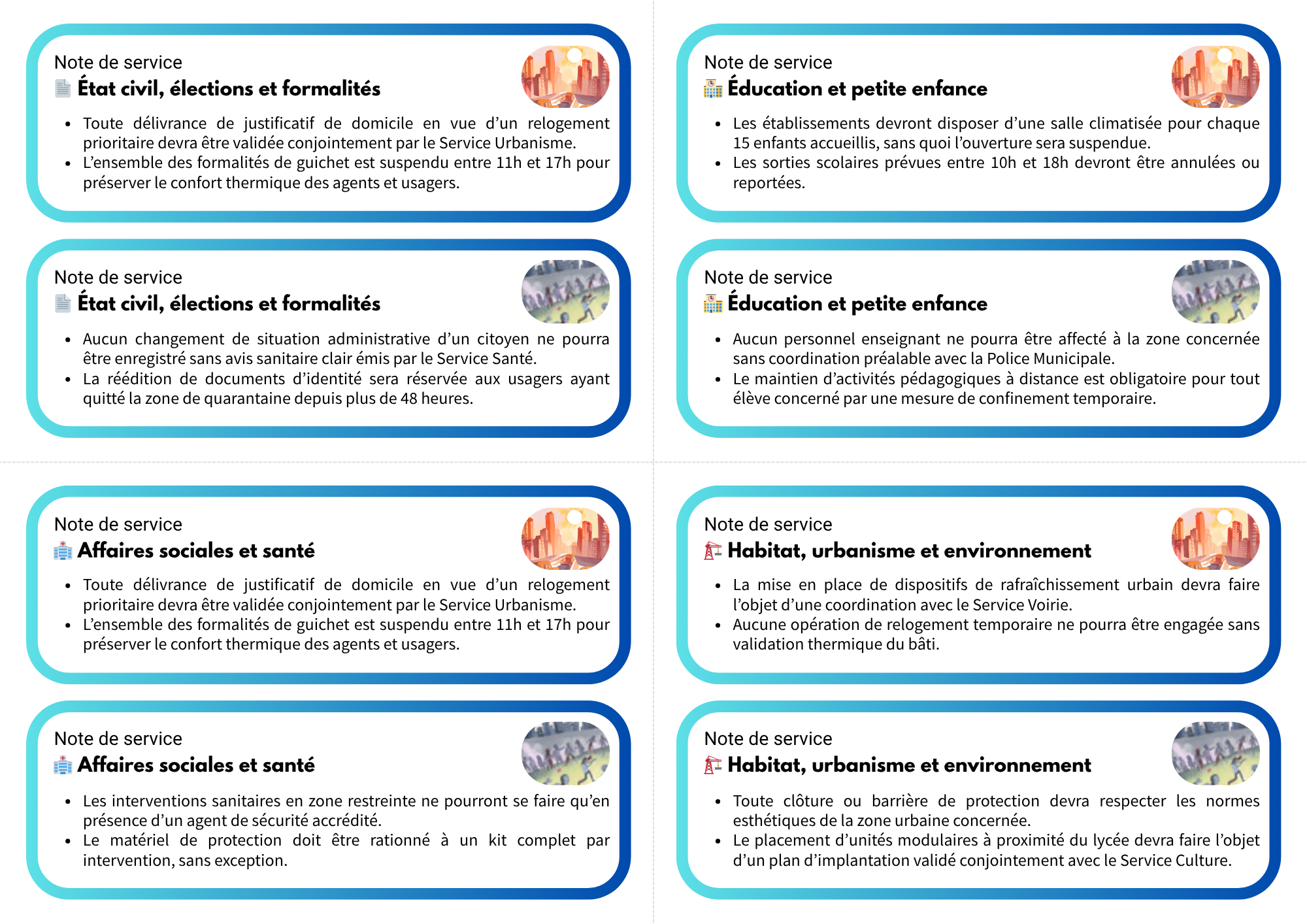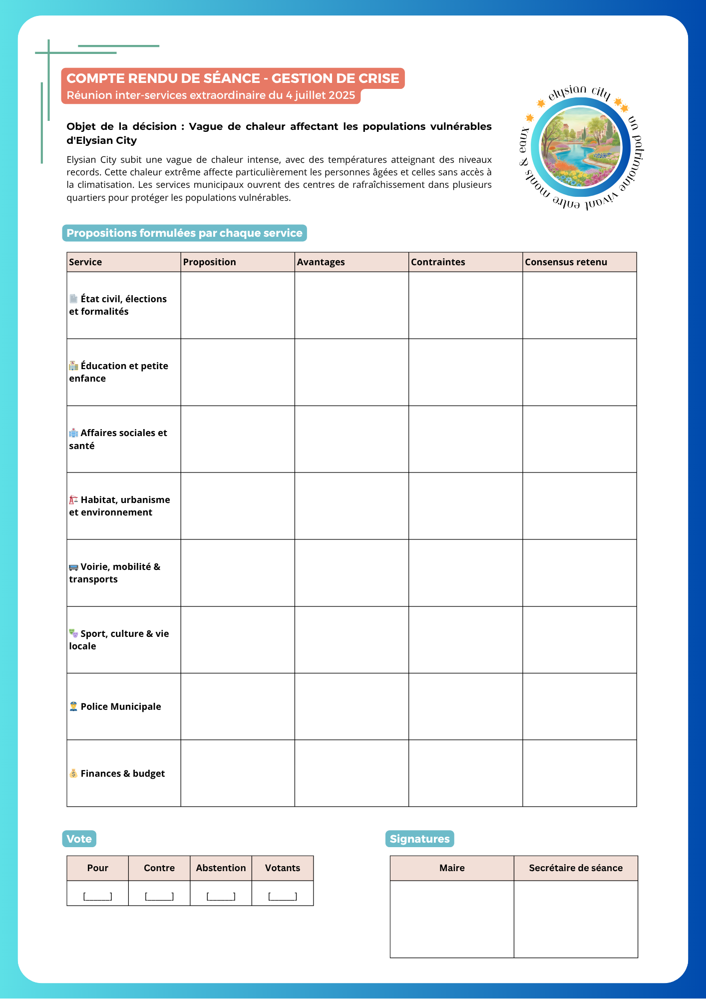 Crise n°9 : Vague de chaleur affectant les populations vulnérables d'Elysian City. Elysian City subit une vague de chaleur intense, avec des températures atteignant des niveaux records. Cette chaleur extrême affecte particulièrement les personnes âgées et celles sans accès à la climatisation. Les services municipaux ouvrent des centres de rafraîchissement dans plusieurs quartiers pour protéger les populations vulnérables.