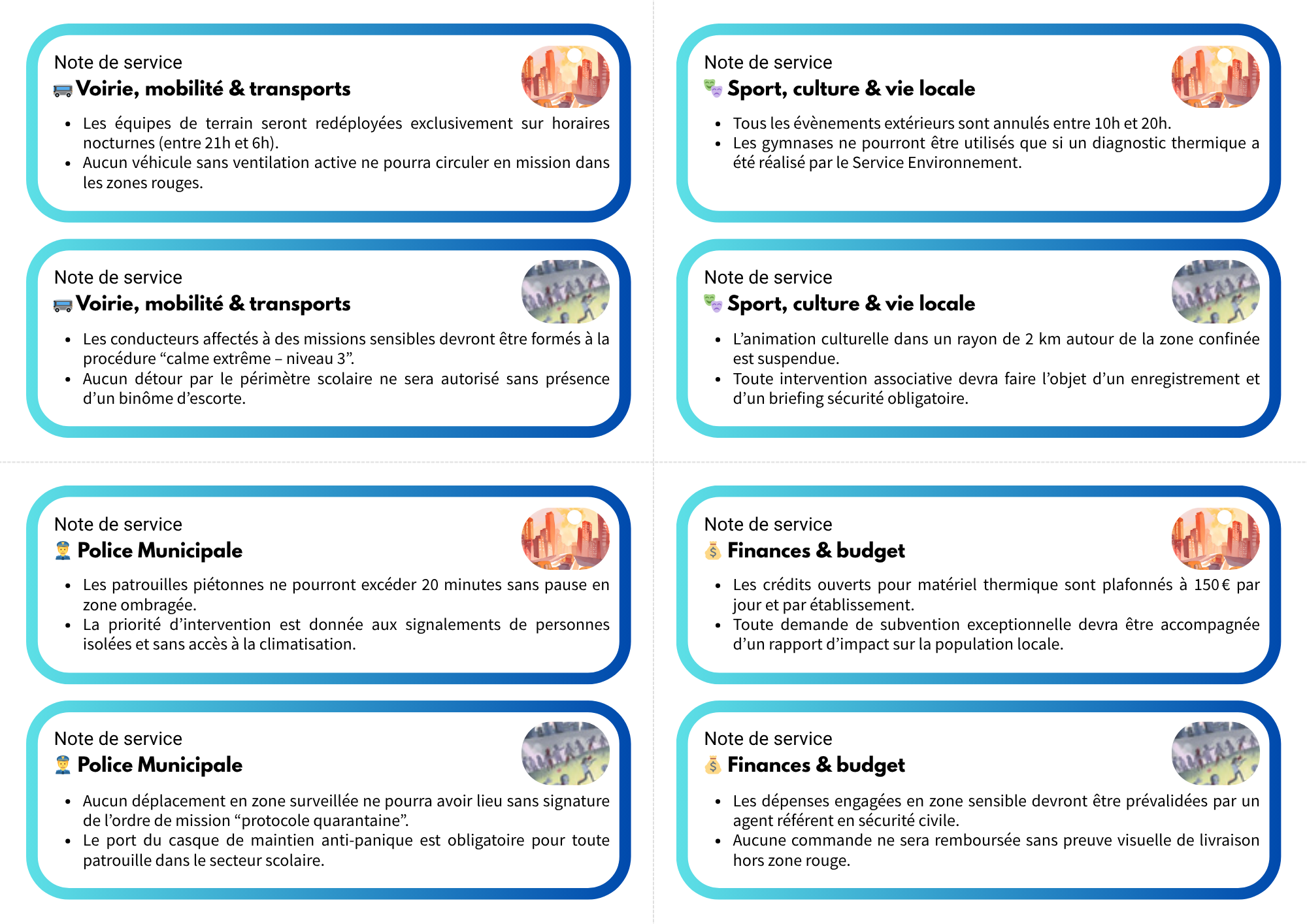 - Relances spécifiques pour chacun des 25 scénarios de crise (questions ciblées par service municipal et par type d'enjeu).