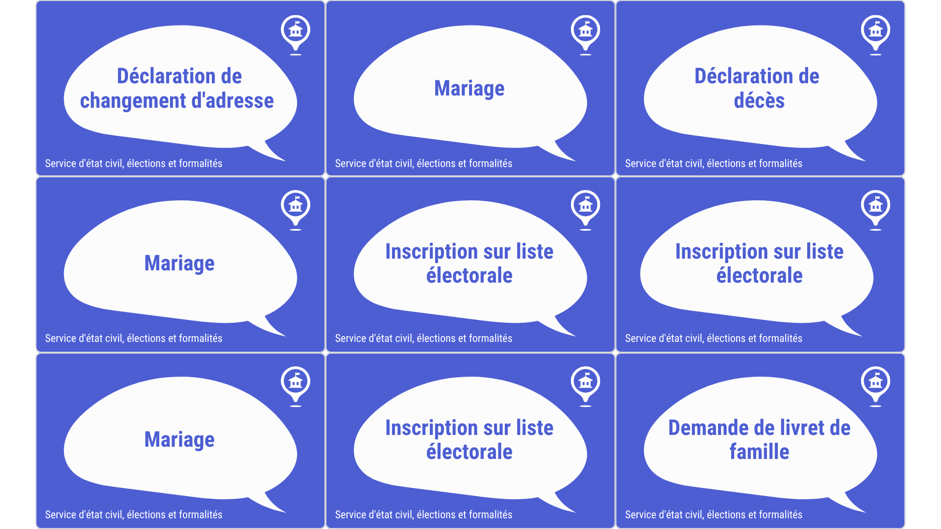 Si les services municipaux ou les demandes citoyennes diffèrent de votre contexte local, n'hésitez pas à adapter le contenu en créant votre propre liste sur le même format. Les cartes Canva modifiables sont disponibles pour créer une version personnalisée. La liste fournie est construite à partir de l'exemple d'une ville française moyenne ; certains services ont été regroupés pour limiter le nombre de groupes nécessaires aux étapes suivantes.