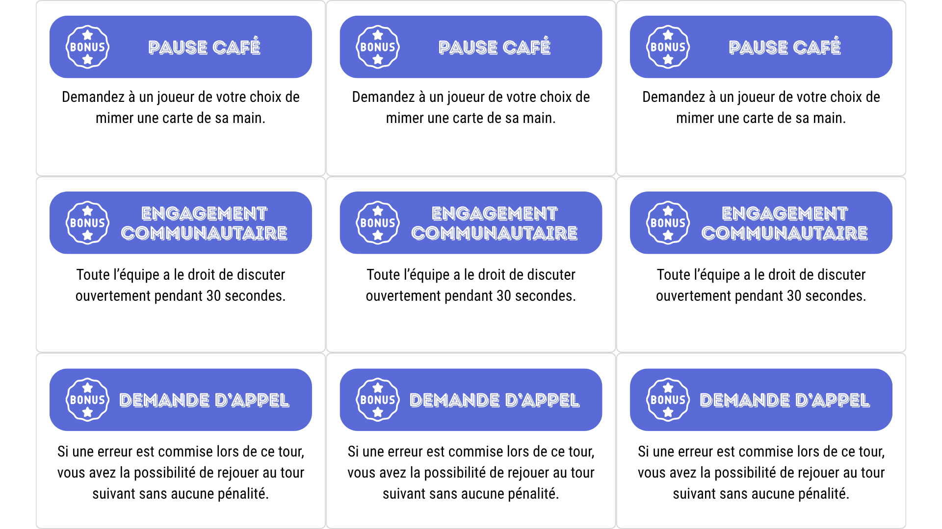 - Cartes « Bonus » (2 pages recto + 2 pages verso optionnelles)