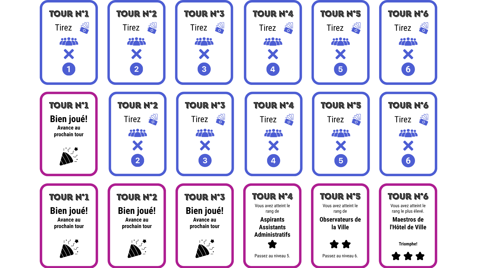- Fin du jeu : au tour 6 réussi, à un tour échoué, ou selon le temps disponible.